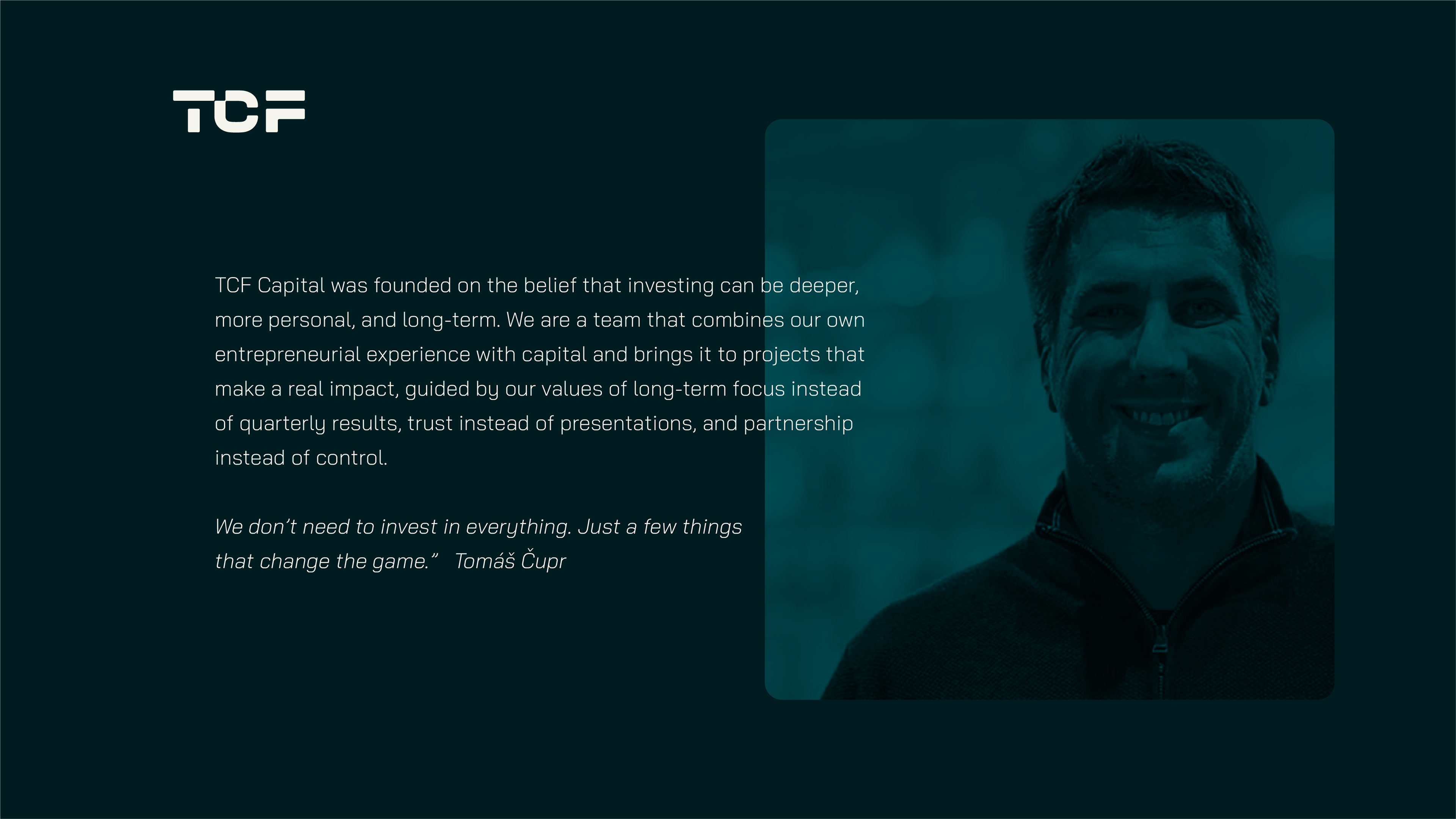 TCF Capital is an investment group led by Tomáš Čupr, founder of Rohlik Group. They focus on building meaningful, long-term businesses in technology and longevity, guided by a philosophy of capital that creates. TCF currently manages €840 million in assets and holds 26 companies in its portfolio.